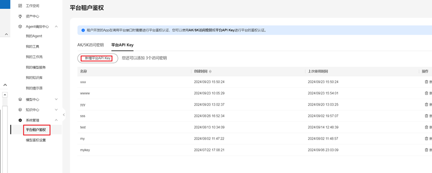 AI引擎管理员权限用户到平台租户鉴权菜单新增平台APIkey.