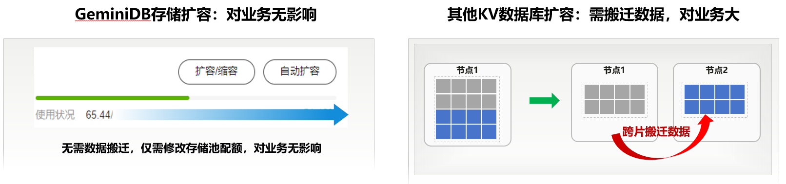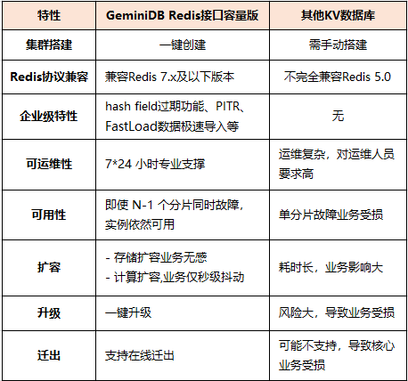 基于上表可以看出,在兼容性、运维、可用性等方面,GeminiDB Redis接口容量版表现更优。同时支持用户平滑在线迁入和迁出,目前,已经帮助多个用户从其他KV数据库搬迁至GeminiDB,搬迁方案详见数据迁移方案概览(https://support.huaweicloud.cn/redisug-nosql/nosql_migration_0002.html)。