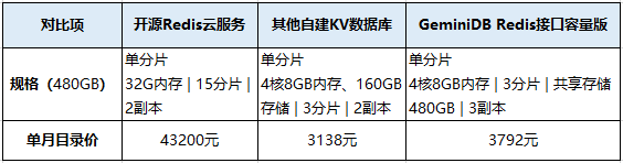 结合上表可以看出,在相同规格情况下,GeminiDB Redis 接口容量版和其他自建KV数据库成本接近,仅为开源Redis云服务的8%。