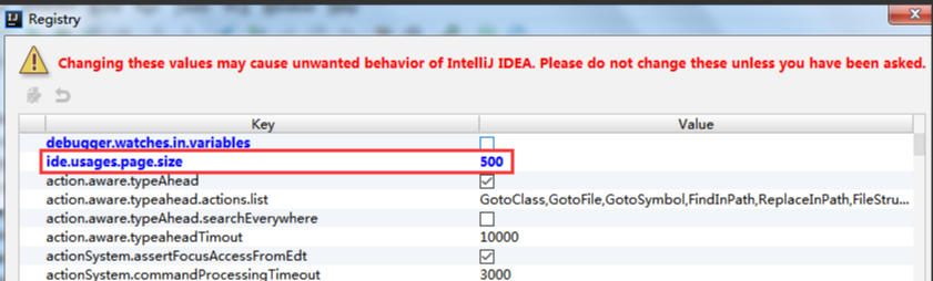 如果是2021前版本,使用快捷键Ctrl + Shift + Alt + / ,选择Registry,然后找到参数ide.usages.page.size,默认为100,设置为自己需要的大小。如下: