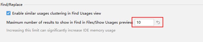 File -> Settings -> Advanced Settings -> Find/Replace,修改Maximum number of results to show in Find in Files/Show Usages preview的值即可。