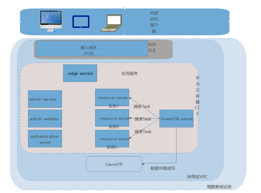 基于计划书和华为云组件简易的画了个模型图帮助理解,最核心的处理点是PowerJob-server用GaussDB存储上面应用层的数据,然后把任务调度到resource-server示例上面执行,查看执行结果做验证。模型如下: