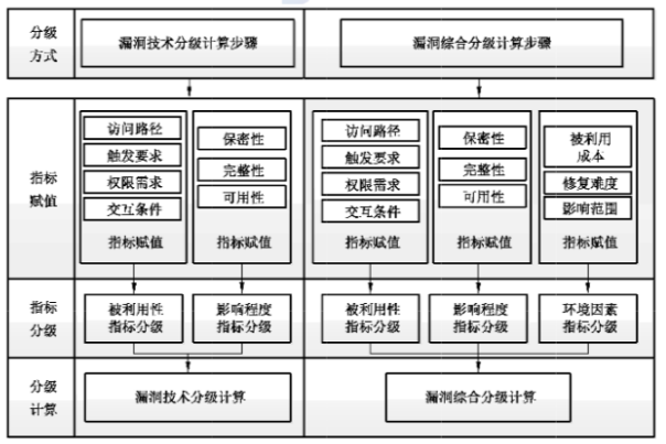 漏洞分级过程主要包括最初的指标赋值、中间的指标评级和最后的分级计算三个步骤,