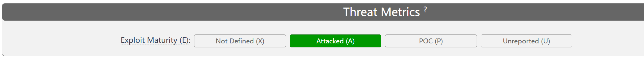 | 漏洞利用成熟度(Exploit Maturity(E)) | Attacked 攻击 | 在野外有已知的漏洞。 |