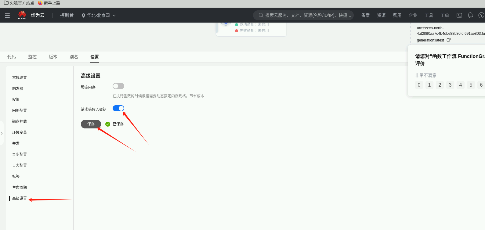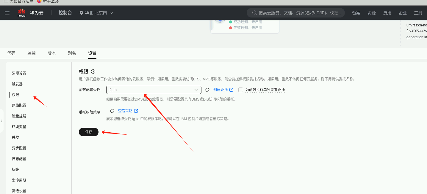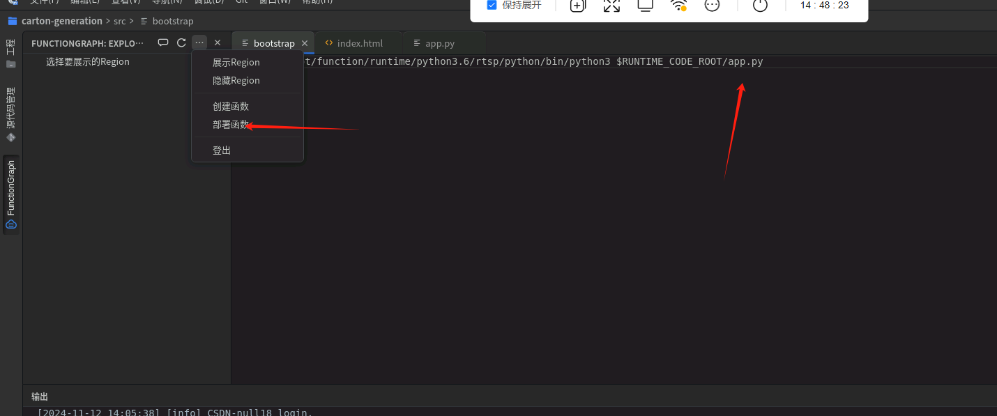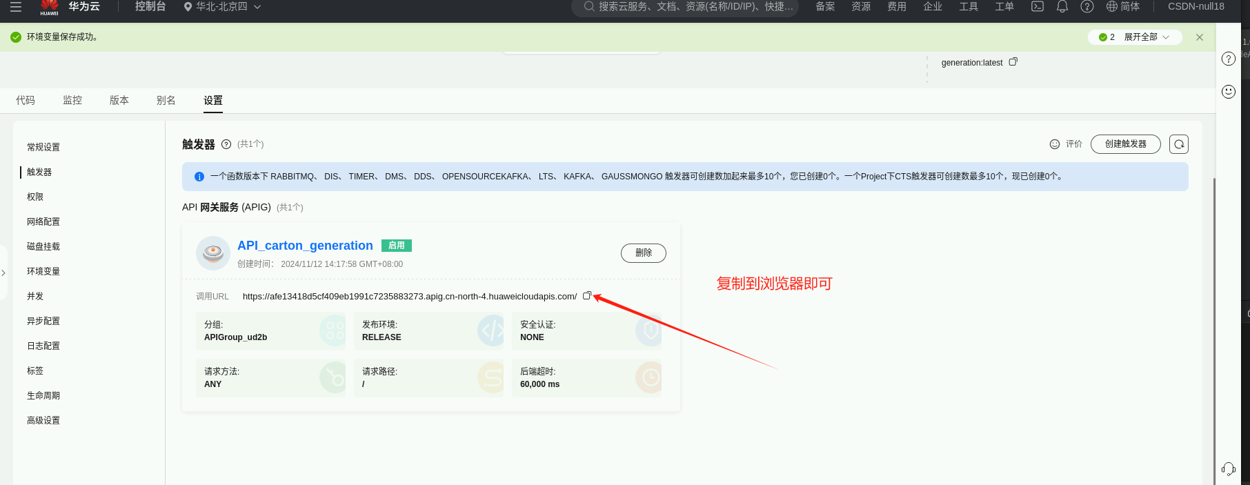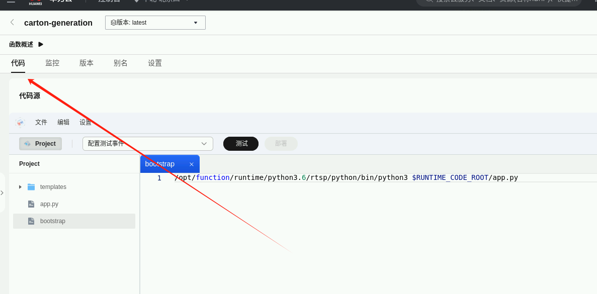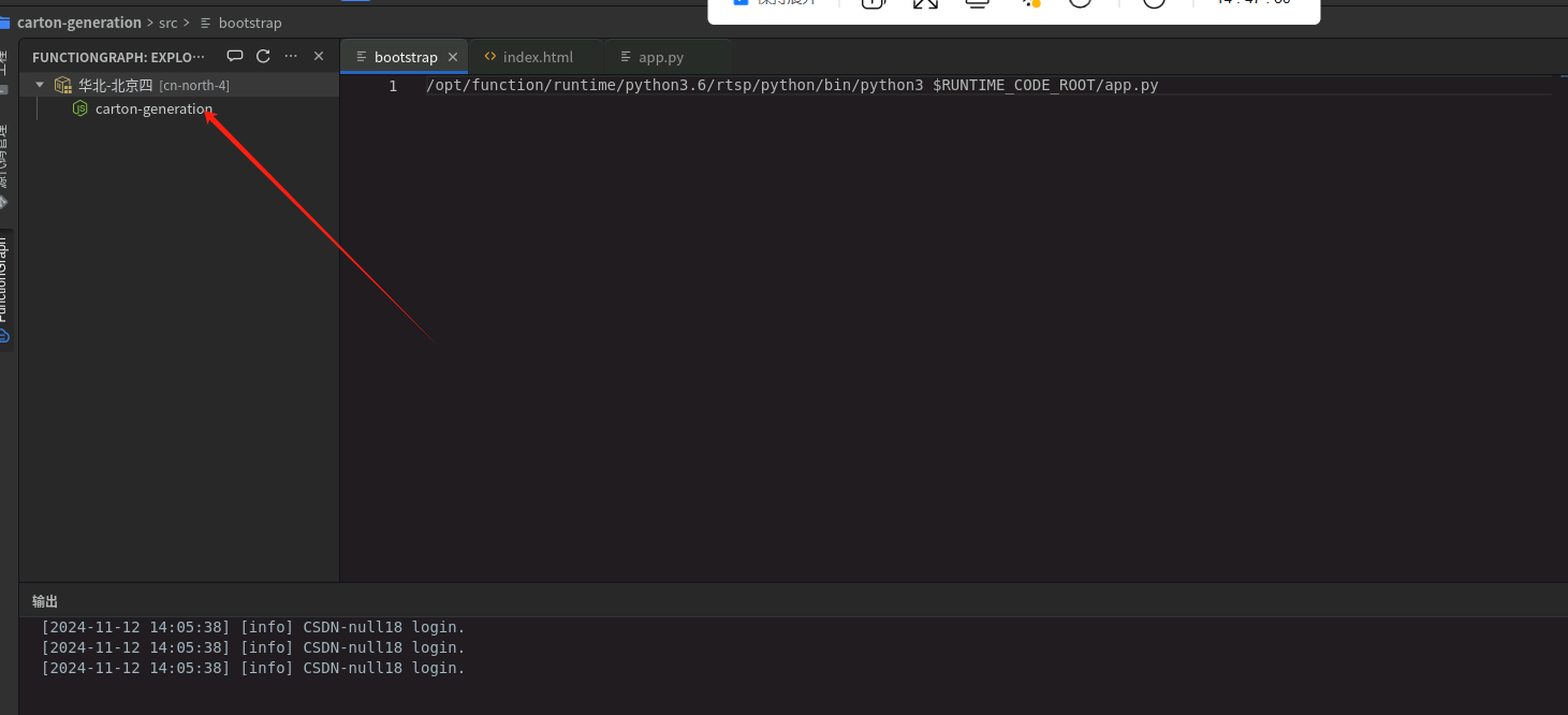之后就部署成果了,点击“选择要展示的Region”,选择“华北-北京四”,可以看到该区域下刚部署好的函数:carton-generation,右键选择函数,点击浏览器打开,跳转到函数详情界面