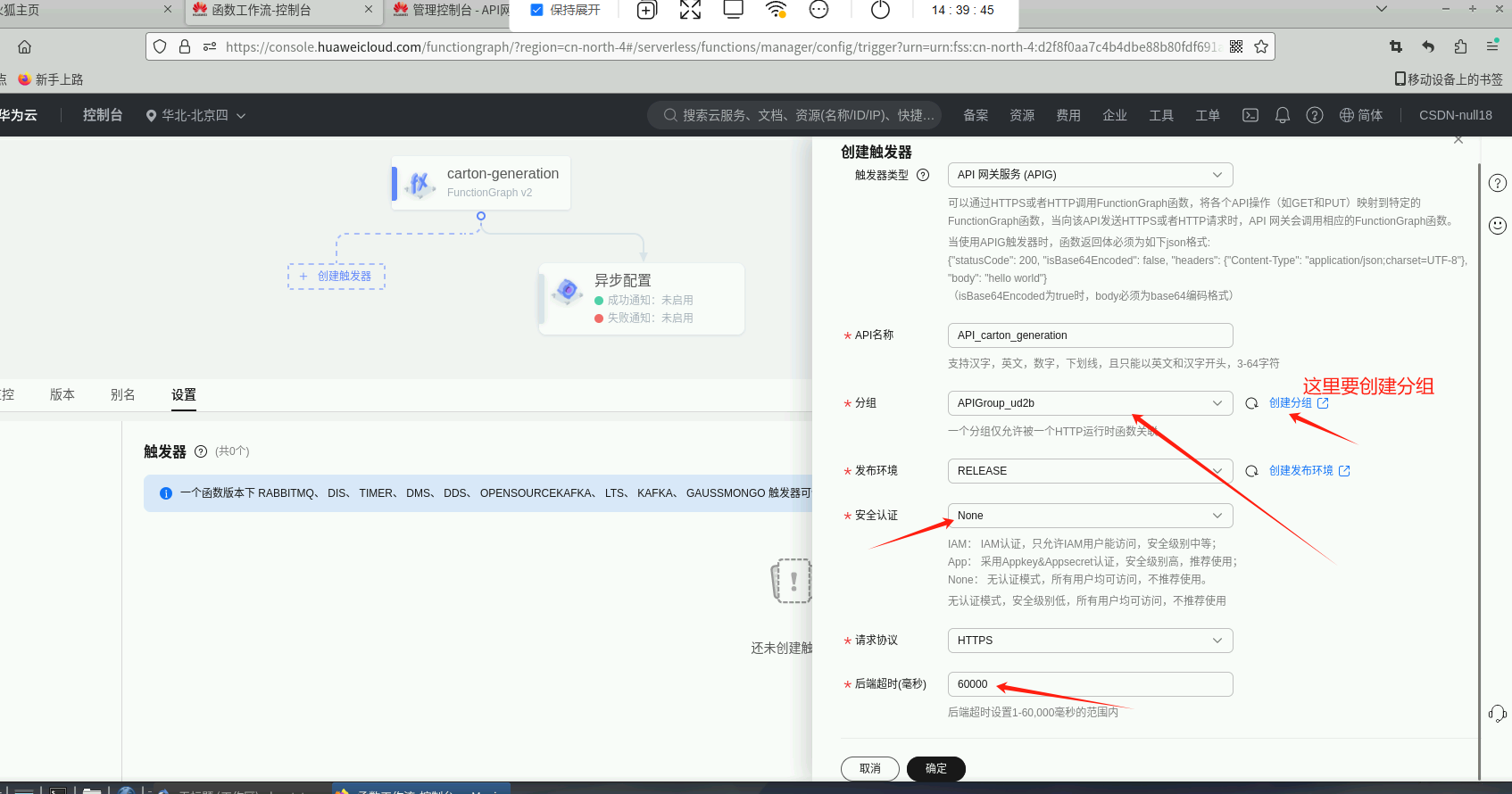 点击“创建触发器”,选择“触发器类型”,选择“分组”(如果没有分组需先创建),选择“安全认证”,设置“后端超时”。