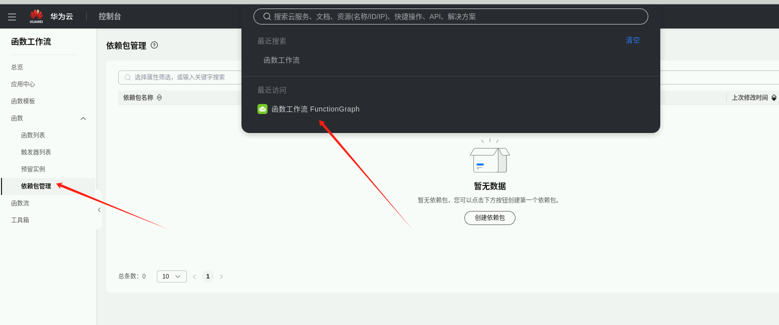 返回“函数工作流”管理界面,选择“依赖包管理”,点击“创建依赖包”。