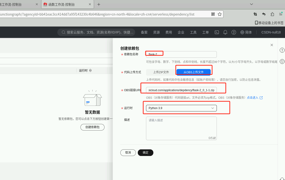 填写“依赖包名称”,代码包上传方式为“从OBS上传文件”,将OBS链接粘贴到“OBS链接URL”中(OBS URL:https://functionstorage-cn-north-4.obs.cn-north-4.myhuaweicloud.com/applications/depdency/flask-2_0_1-1.zip )
