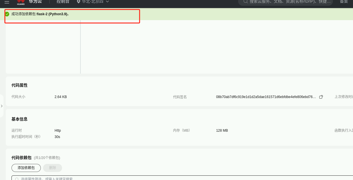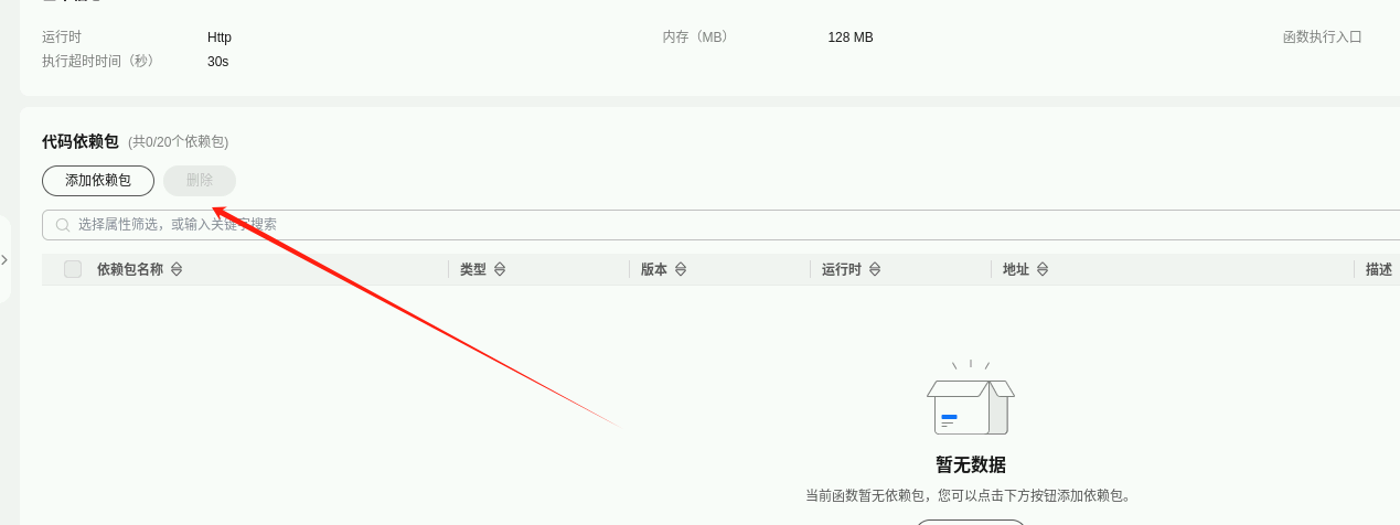 进入函数详情页底部,点击“添加依赖包”。这里有些人可能也找不到,下图可以帮你更快找到
