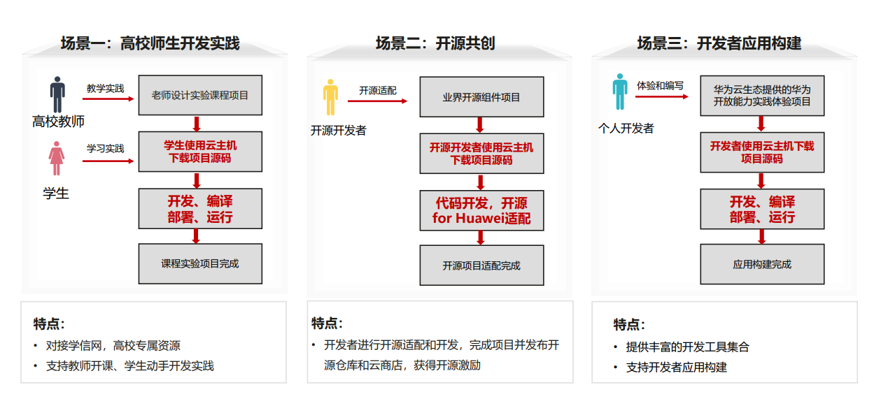 高校师生开发实践,高校可以通过开发者空间搭建实训平台、开展学校赛事、实现学生作业数据存储。学生通过开发者空间进行学习实践、开发实践,完成课程实验项目;