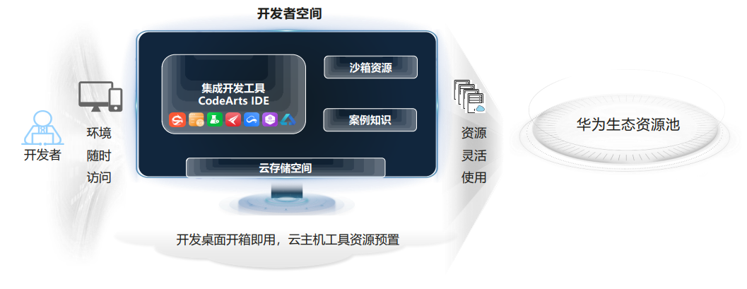 • 云主机开发桌面即时访问:华为开发者空间为每一位开发者提供一台云主机,开发者通过Web链接即可实现随时随地访问,开机即可开始学习体验。