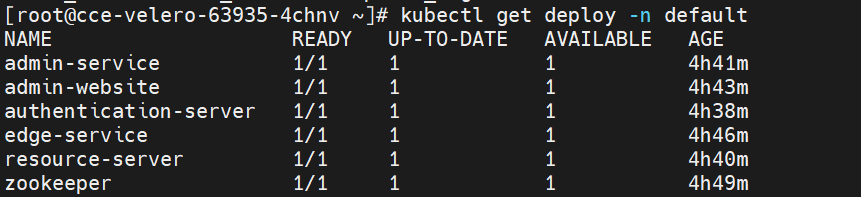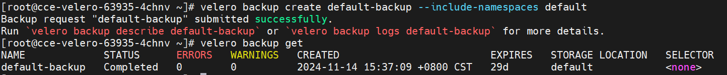 运行velero backup命令备份default命名空间下的所有资源: