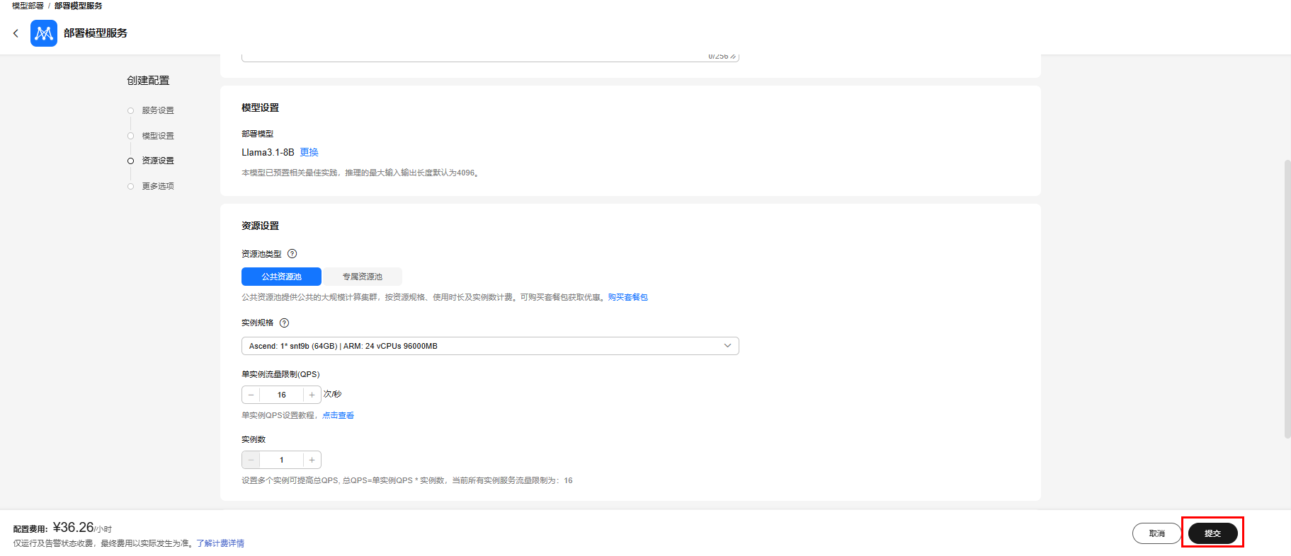 2.在部署页面中配置服务的名称,并选择使用的资源规格和QPS,配置好后点击提交,启动模型部署。