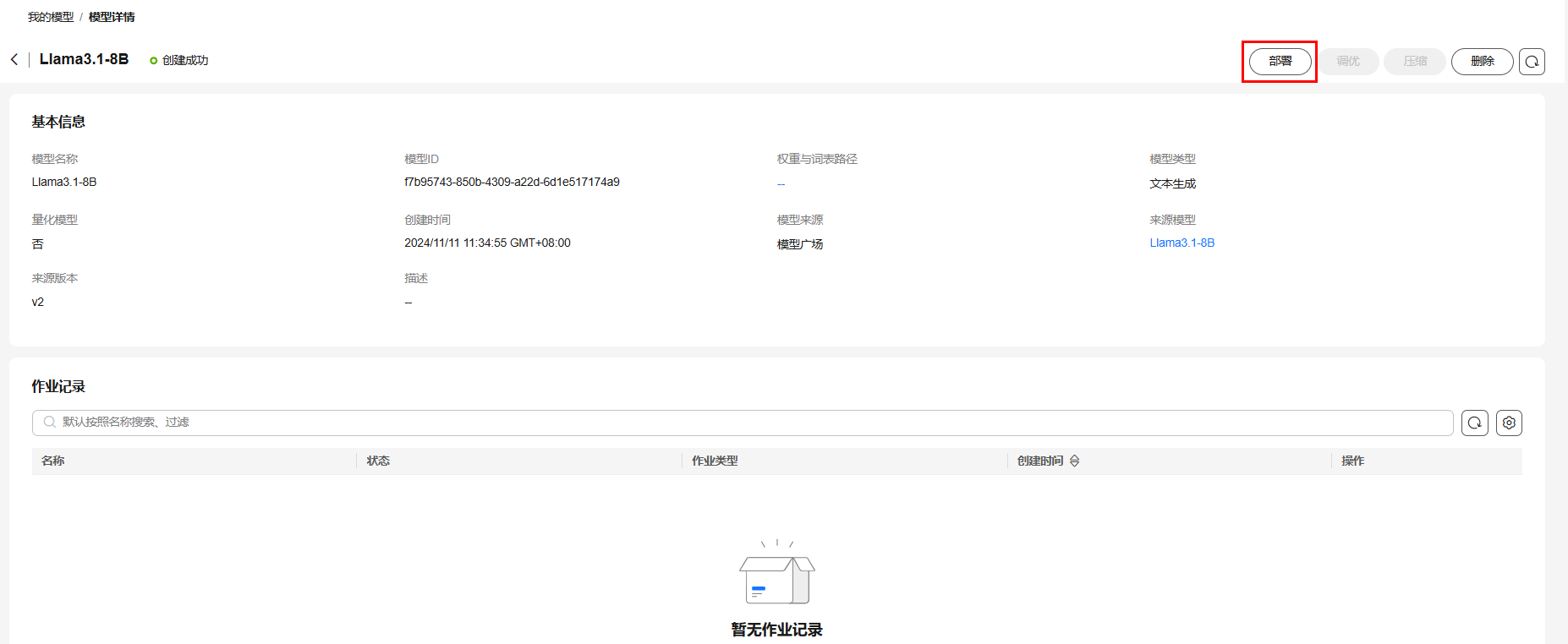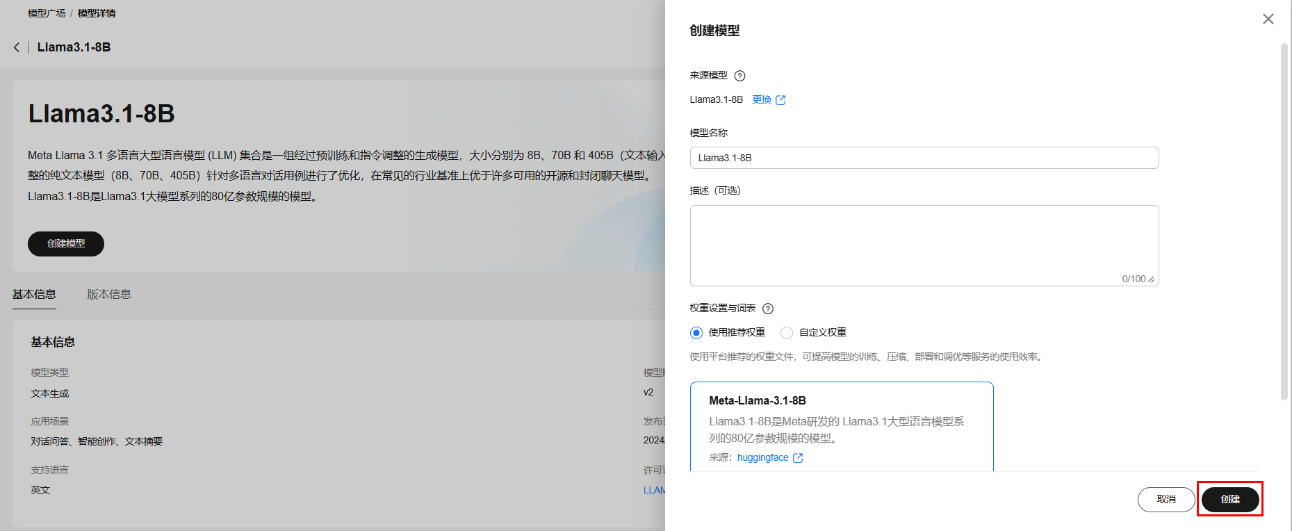 2.单击左上角创建模型,在右侧弹出窗口中自定义模型名称,选择要使用的权重文件。MaaS已预置了原始的开源模型权重,同时支持从OBS桶中导入微调过的自定义权重,本示例选择使用“使用推荐权重”,配置好后点击创建。
