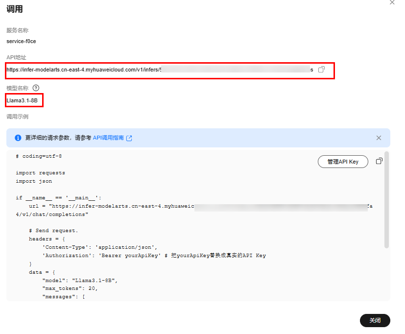 2.在弹窗中可以查看到该服务的API地址以及调用时使用的模型名称。