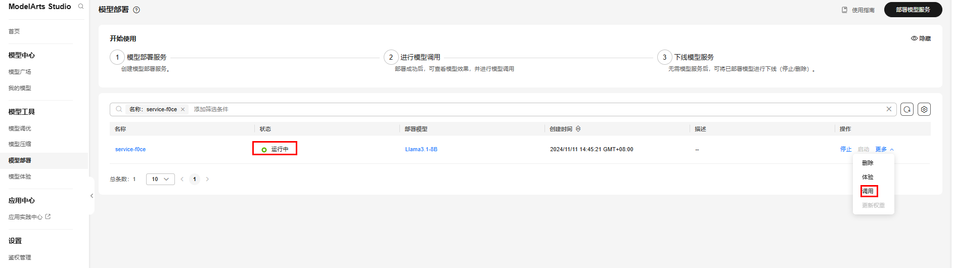 1.服务状态为“运行中”时,表示已部署完成,此时可以单击右侧的“更多”-->“调用”。