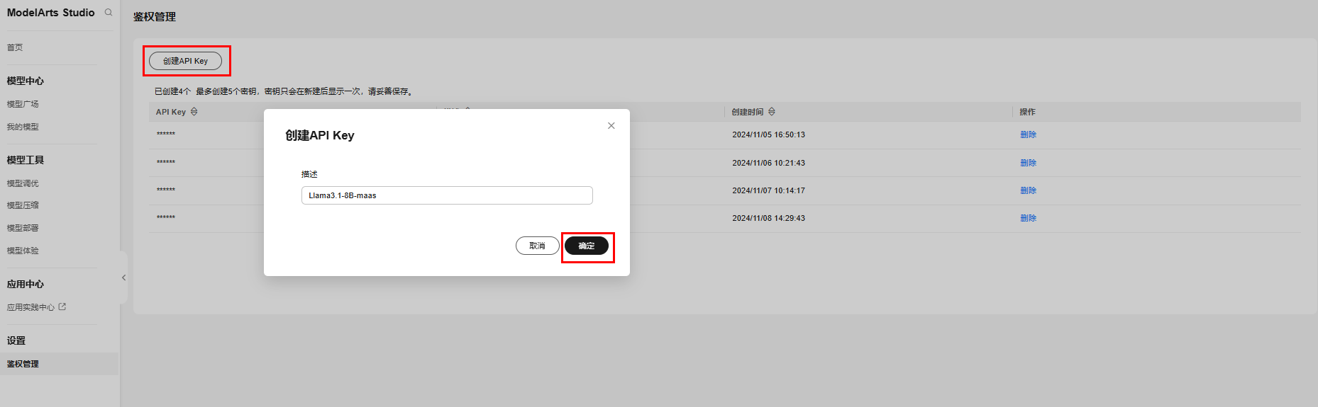 2.在“鉴权管理”页面,单击“创建API Key”,填写描述信息后,单击“确认”会返回“您的密钥”,请复制保存密钥,单击“关闭”后将无法再次查看密钥。