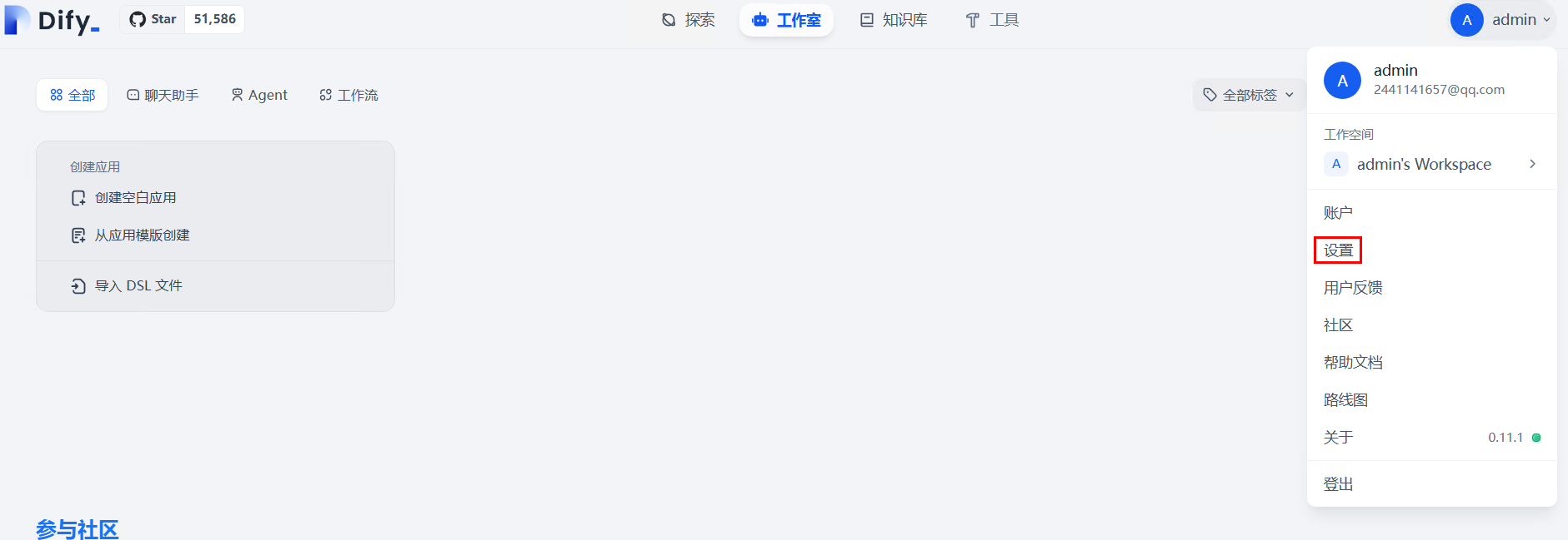 1.浏览器进入您部署的Dify平台界面,如果您想快速部署开箱即用的Dify LLM应用开发平台,可参考:快速搭建Dify LLM应用开发平台。