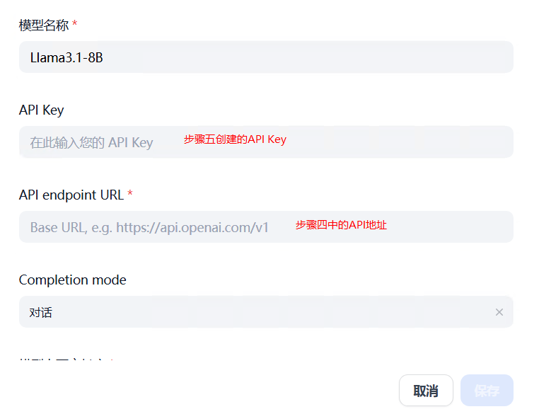 -"API endpoint URL"请填入步骤四中的API地址,并且删除最后面的“chat/completions”部分