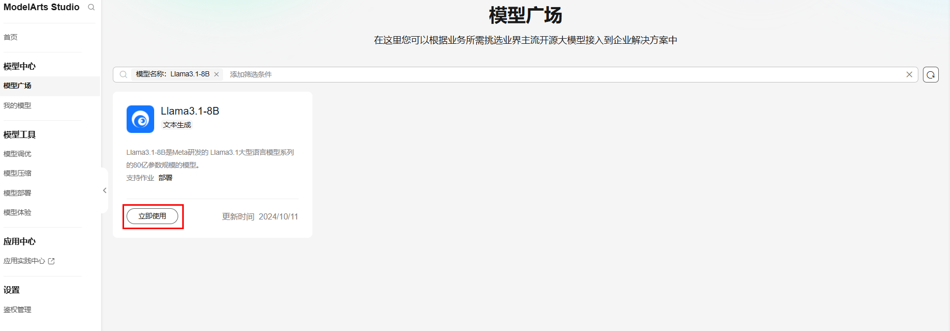 1.在MaaS的模型广场选择您想要使用的大语言模型,点击立即使用。为保证Agent效果,我们建议使用7B及以上参数量的模型。本实例选择“Llama3.1-8B”,单击立即使用。