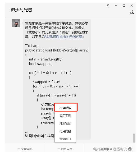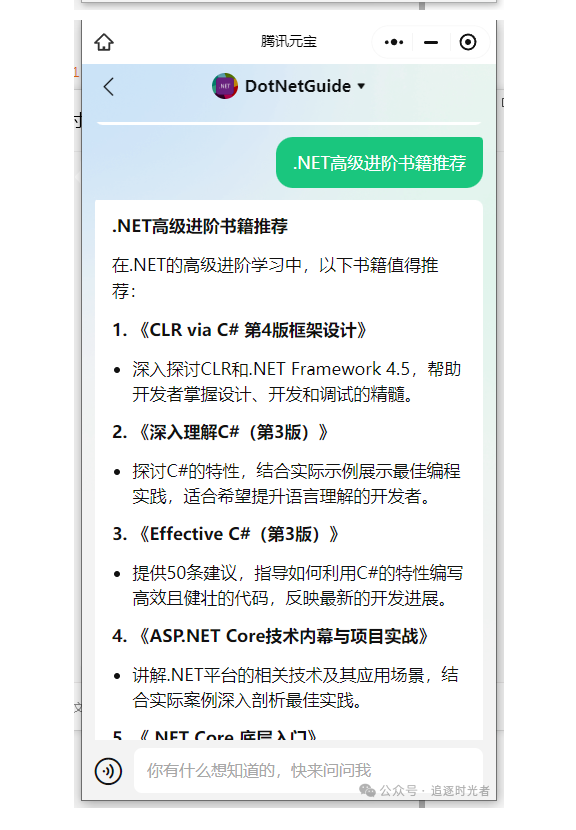 经常有粉丝朋友在公众号后台私信提问,因为个人平时比较少看公众号后台的私信所以没法及时回复。最近发现腾讯推出了一个可以创建和使用各种智能体的平台(帮助小白也能快速使用AI):腾讯元器,正好自己每天也在公众号更新.NET相关的文章(到目前为止.NET相关的文章应该有400多篇了)有着较为丰富.NET相关的知识库,因此今天我将利用腾讯元器,将我的公众号变身为一个强大的.NET AI智能体,造福我的.NET粉丝朋友们。