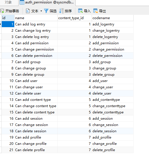 这是Django的权限表,里面有一个content_type_id关联的就是django_content_type表,所以而django_content_type表中关联了APP和模型。所以这是模型级别的权限控制。