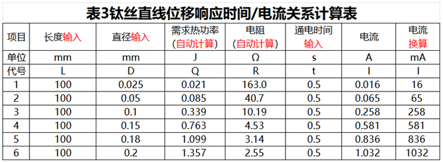 《表3钛丝直线位移响应时间/电流关系计算表》