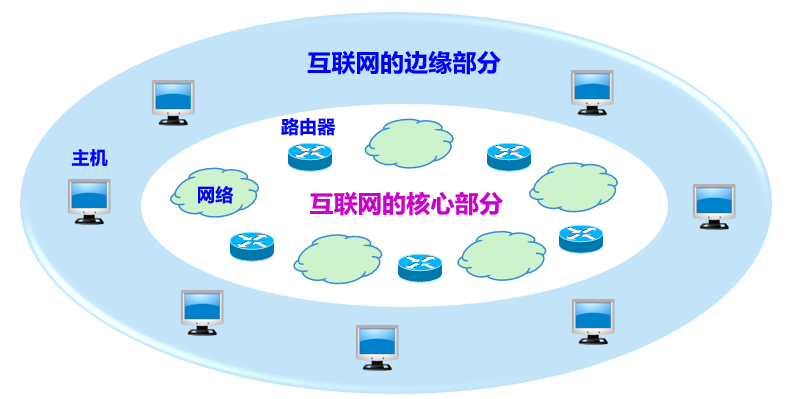 由边缘部分(由所有连接在因特网上的主机组成)和核心部分(由大量的网络和连接网络的路由器组成)组成