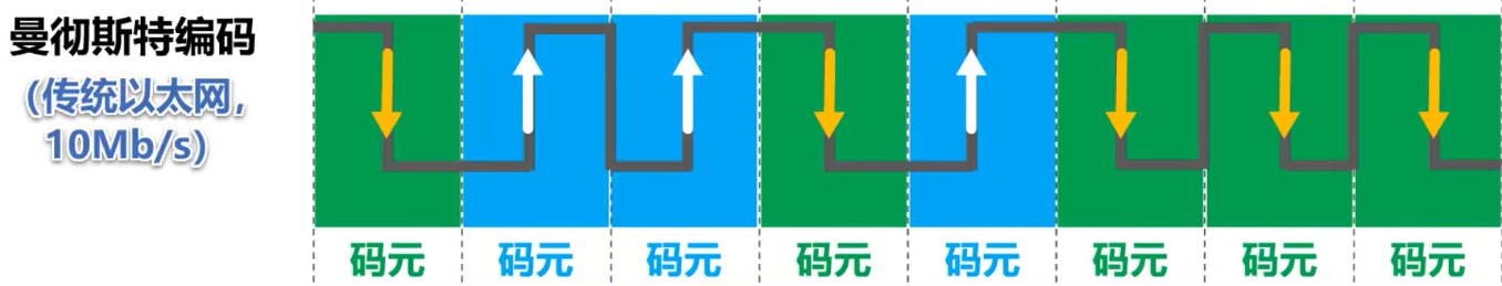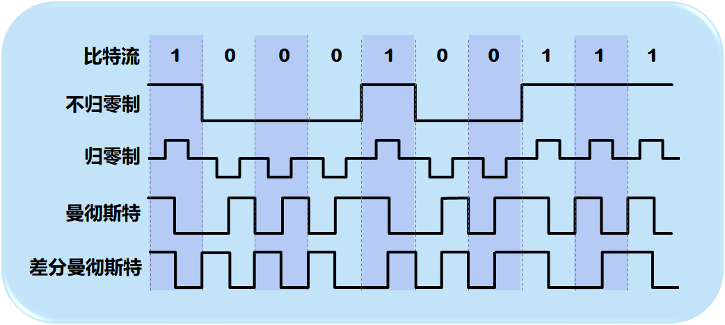 曼彻斯特编码:位周期中心的向上跳变代表0,位周期中心的向下跳变代表1。