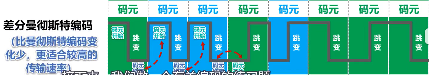 差分曼彻斯特编码:在每一位的中心处始终都有跳变。位开始边界有跳变代表0,而位开始边界没有跳变代表1。