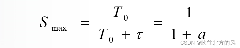 假定以太网上的 各主机发送 数据都不会产生 碰撞,并且总线 一旦空闲就有 某主机立即 发送数据 。在这种 理想情况 下,发送 一帧占用线路的时间是 T 0 + t ,而帧本身的发送时间是 T 0 , 于是极限 信道利用率 S max 为: