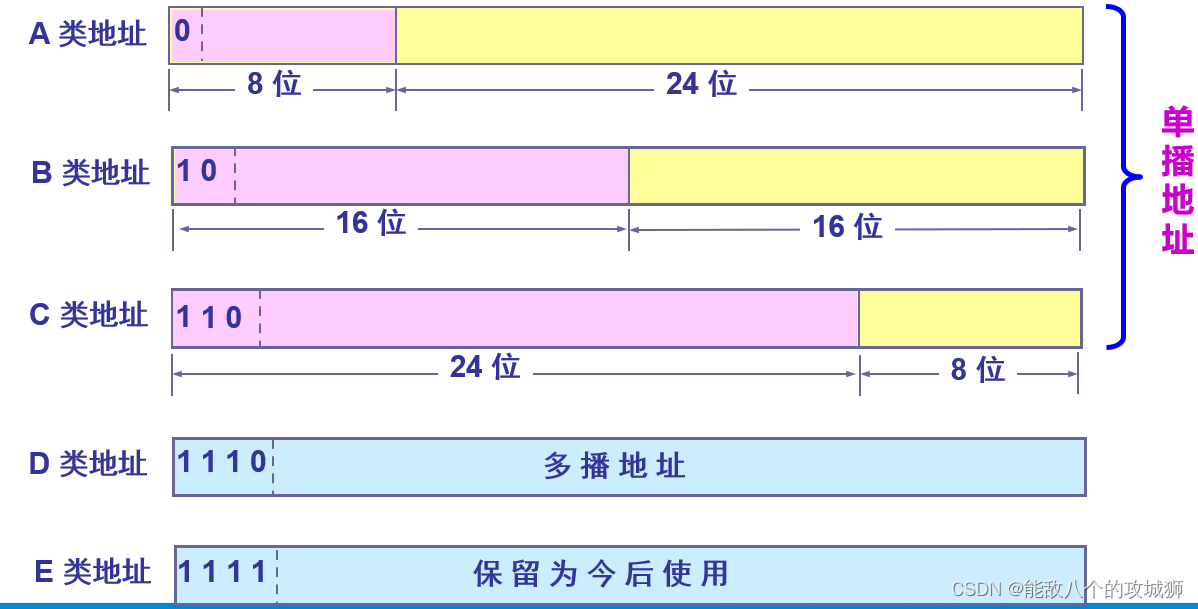 C类地址:前三个字节为网络号,第一个字节前三位为0,范围192-223,默认子网掩码为255.255.255.0