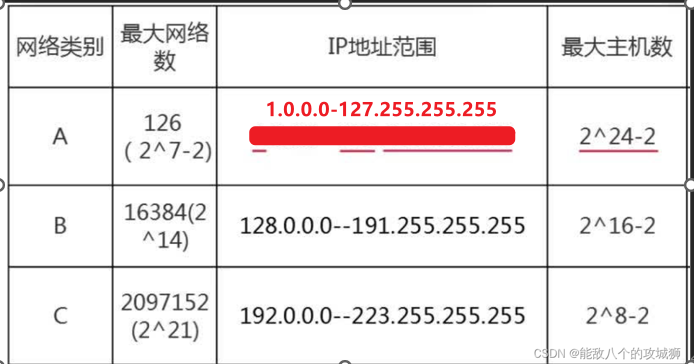 A类地址:第一个字节为网络号,第一个字节的第一位为0,范围1-126,默认子网掩码为255.0.0.0