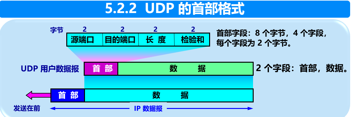 首部格式:源端口、目的端口、长度、检验和 共8字节