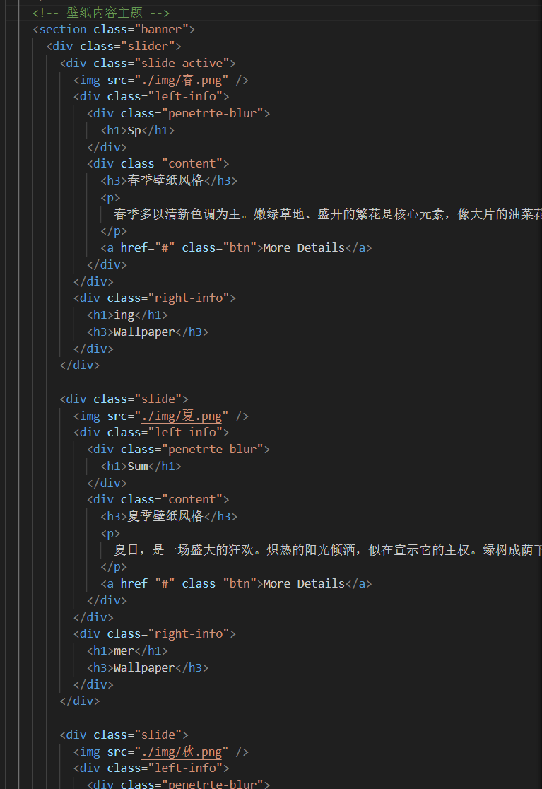 HTML结构: 包含头部(header)、导航栏(navbar)、轮播图(slider)和四个季节风格的壁纸展示区。