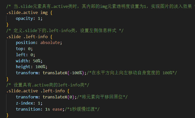 CSS样式: 使用.banner类设置全屏背景,.slide类控制每个轮播项的布局,.active类控制当前显示的轮播项。使用transition属性实现平滑的图片切换效果。