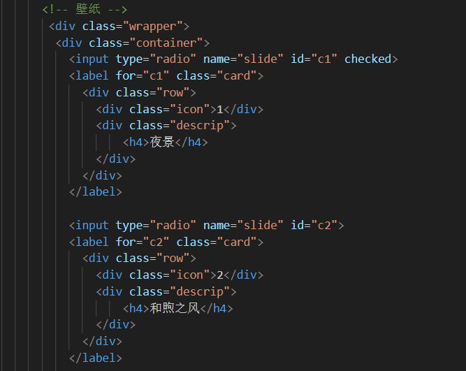o 壁纸卡片(card),每个卡片包含一个隐藏的单选按钮(input[type="radio"]),一个用于显示的标签(label),以及显示壁纸名称和序号的行(row)。