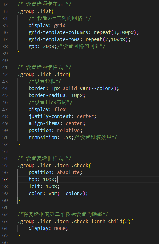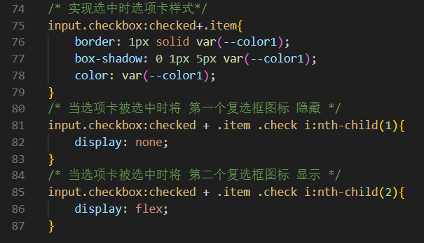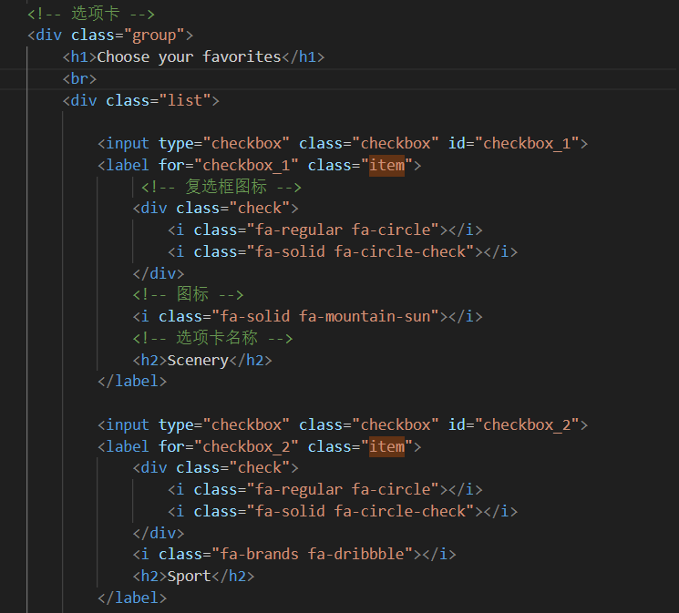 CSS样式: 使用.group和.list类进行布局,.item类控制每个选项卡的样式。使用checkbox和label实现选项卡的选中效果。