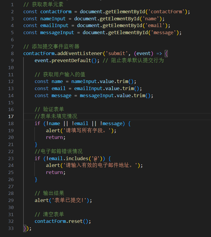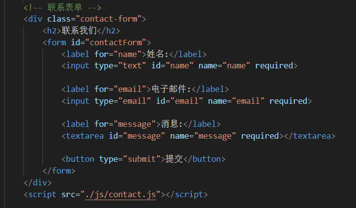 o 一个表单(form),包含姓名、电子邮件和消息的输入字段,每个字段都有required属性,确保必填。