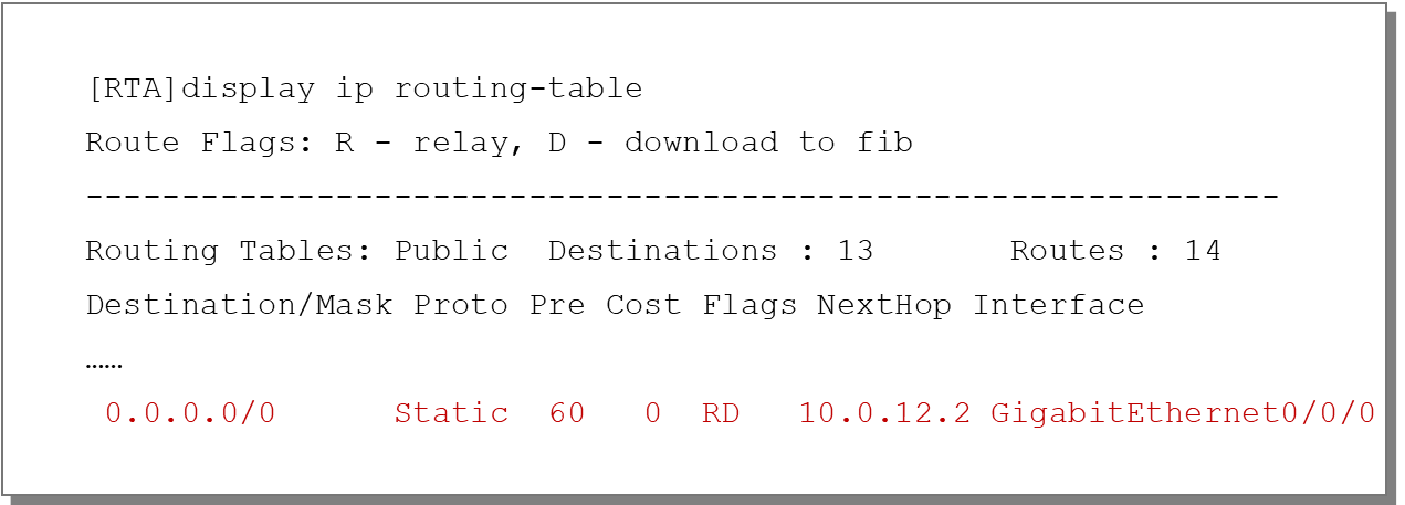 [RTA] ip route-static 0.0.0.0 0.0.0.0 10.0.12.2 GigabitEthernet 0/0/0