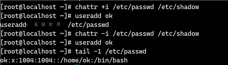 [root@localhost ~]# chattr -i /etc/passwd /etc/shadow