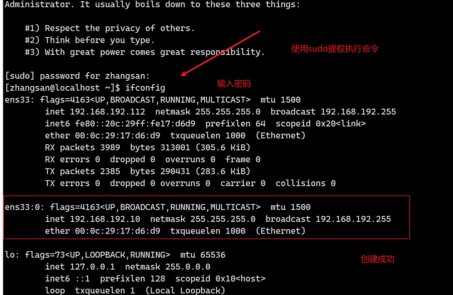 [zhangsan@localhost ~]$ sudo ifconfig ens33:0 192.168.192.10