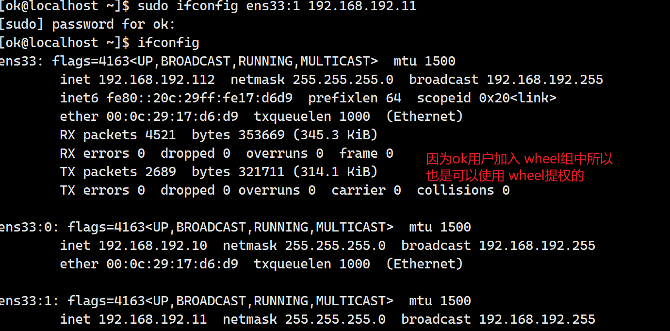 [ok@localhost ~]$ sudo ifconfig ens33:1 192.168.192.11
