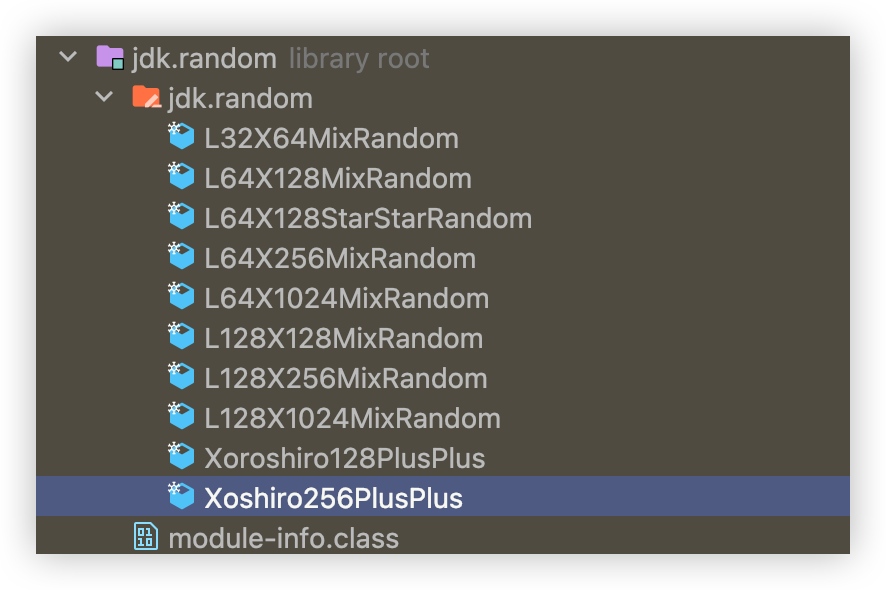 其中 SecureRandom 和 Random 是旧的,其余都是 Java 17 提供的,他们位于 jdk.random 模块下: