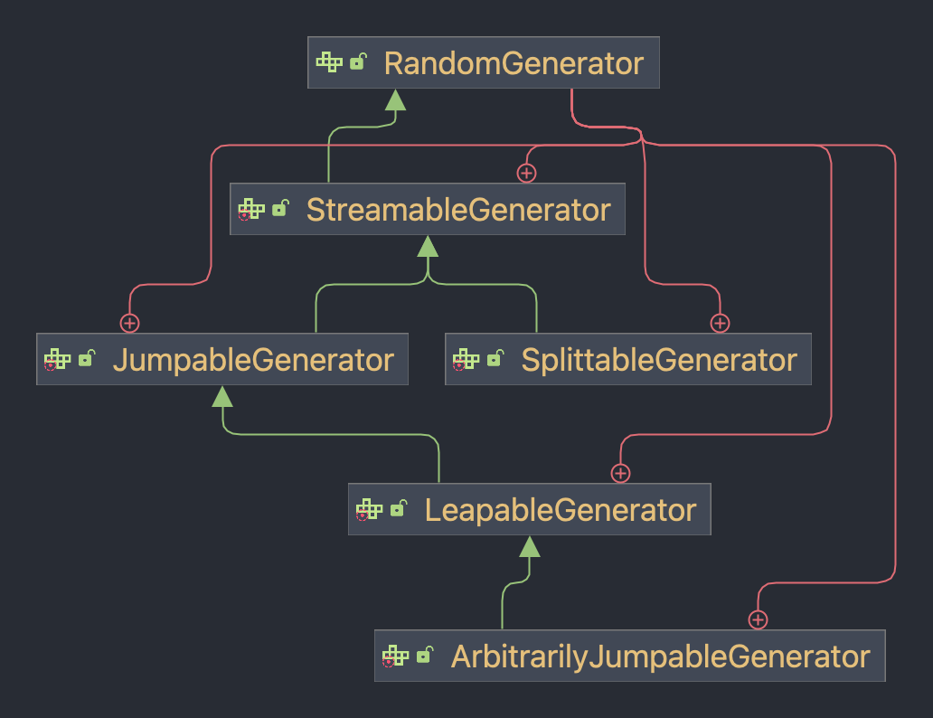 RandomGenerator 作为顶层接口,为了满足不同的随机数应用需求,它有几个子接口,UML 图例如下: