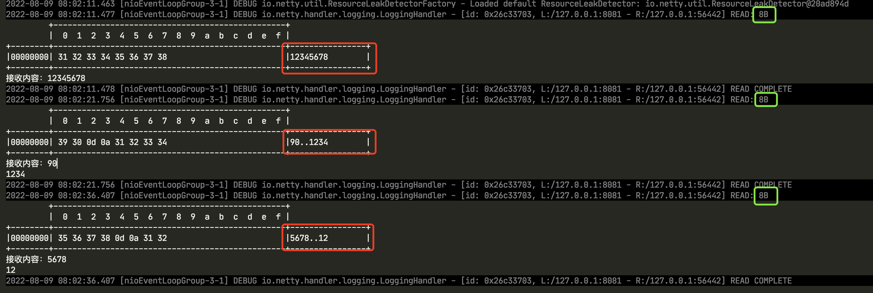 绿色部分是每次读取缓冲区的大小,这里可以看出都是 8 byte。第一次发送 1234567890,服务端只读取了 12345678,其中 90\n还保留这,继续发送 12345678 ,这个时候够了 8 byte,服务端又读取 90\n1234,5678 保留。