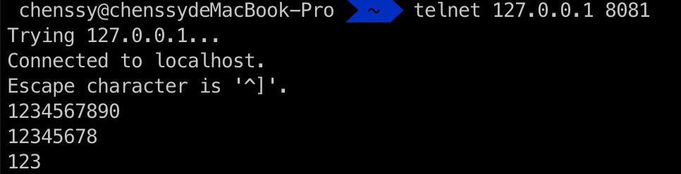new FixedLengthFrameDecoder(8),固定 8 byte 的解码器。我们通过 telnet 命令向服务端发送数据,发送内容为: