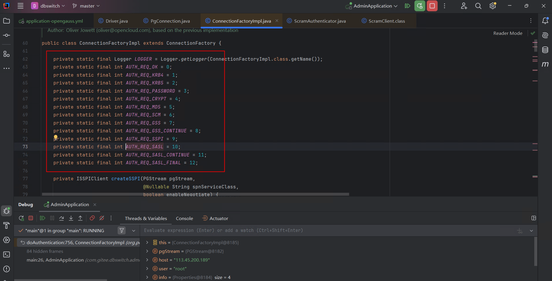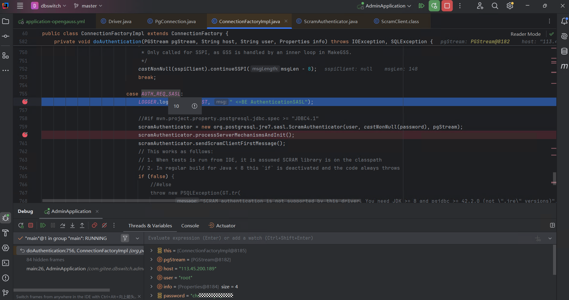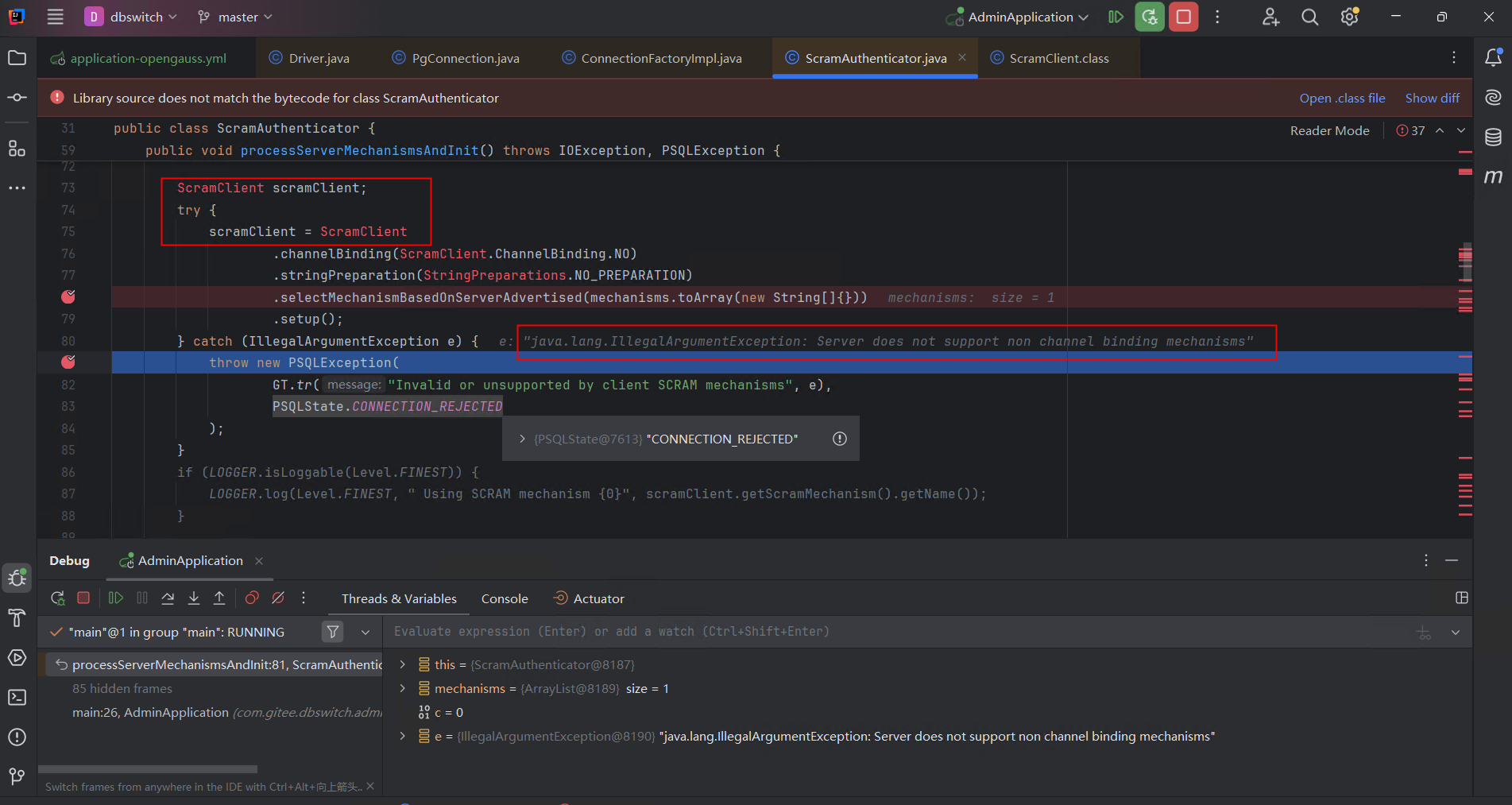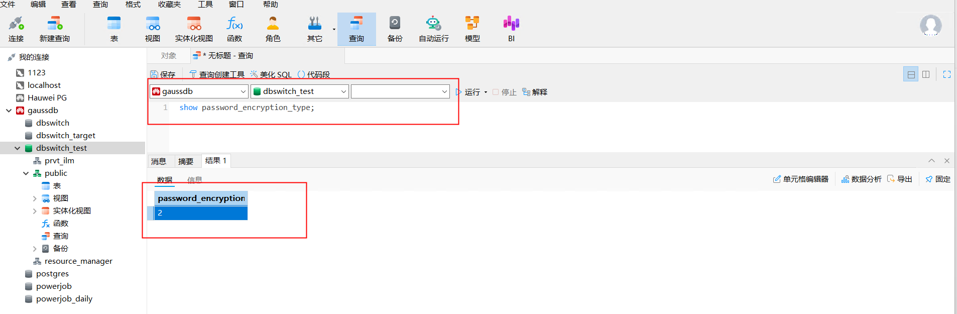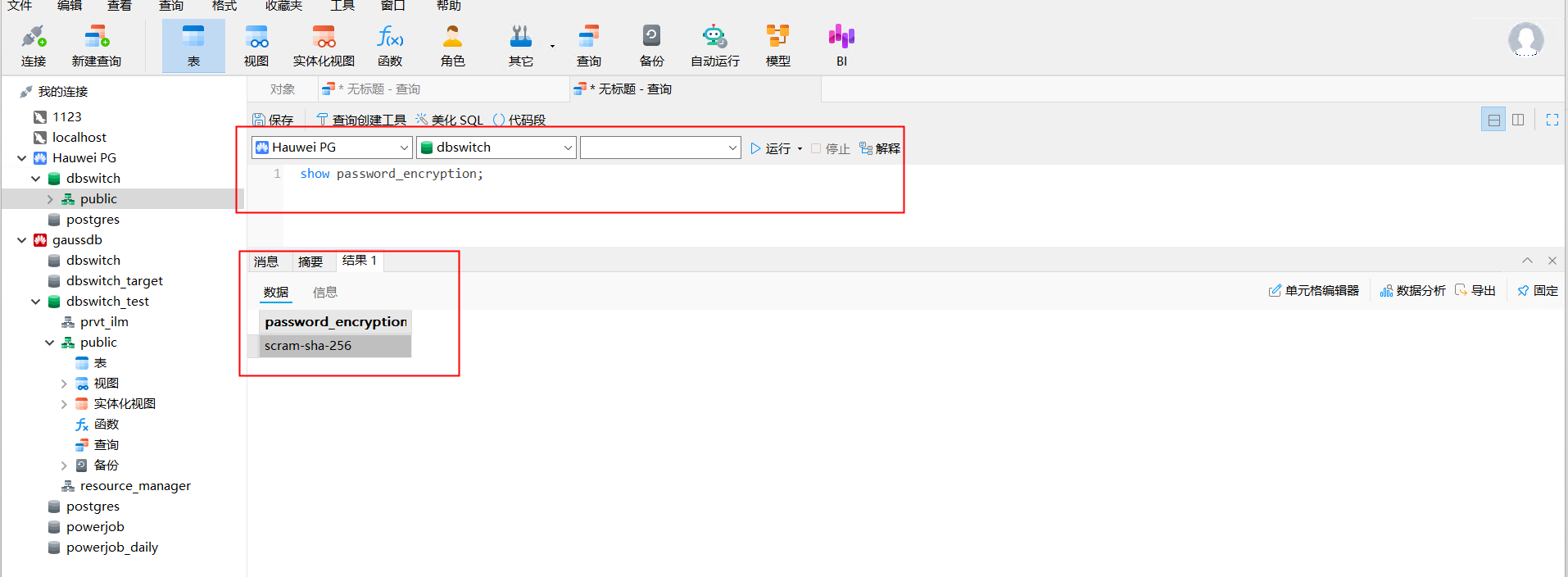 通过上面的代码追踪和数据库查看可以知道PostgreSQL在10版本之后使用的是SCRAM/SASL的连接认证方式,GaussDB使用的是sha-256的认证方式,两者的认证方式不一样。默认不可用PostgreSqL驱动连接GaussDB。
