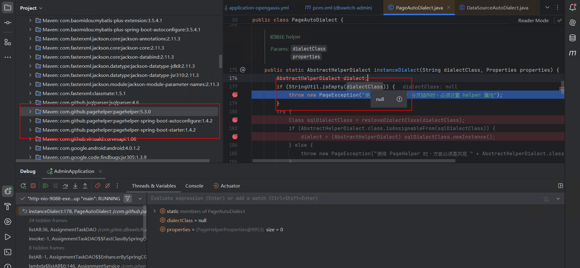 缺少dialectClass。通过https://cloud.tencent.com/developer/article/2229619 了解到前人踩坑过程,是Pagehelper插件的问题,针对dialect的处理机制:默认它会通过配置的连接串用mysql去识别,换了连接串后,需要通过配置文件指定mysql。 配置文件的参数,有横线和驼峰的区别(1.4.4版本之前,有bug,只能识别驼峰式的配置)。我这里处理直接升级pageehelper版本到1.4.7后解决此问题。
