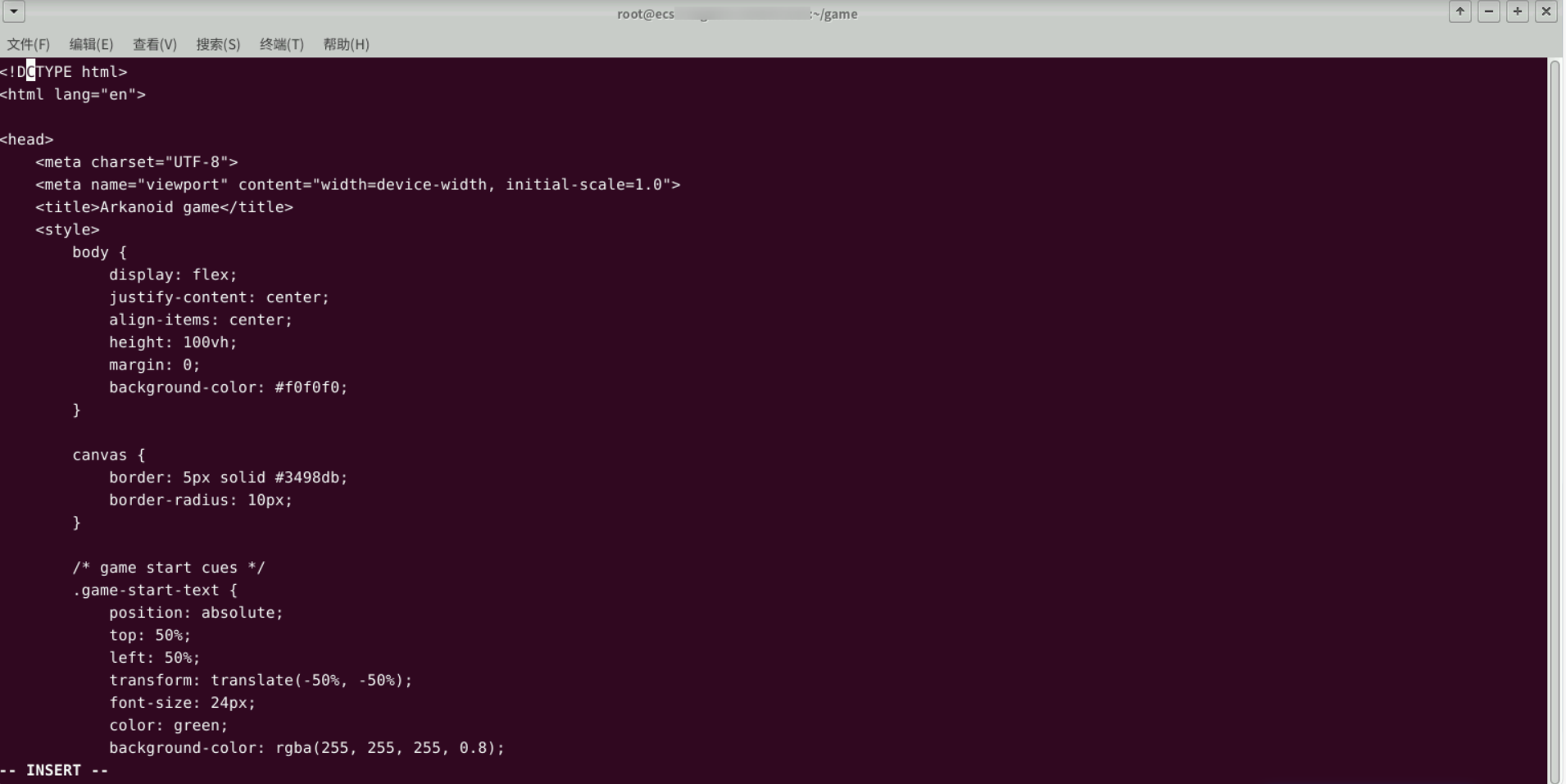 按下ESC按钮退出编辑模式,输入“:wq”,退出并保存game.html文件。